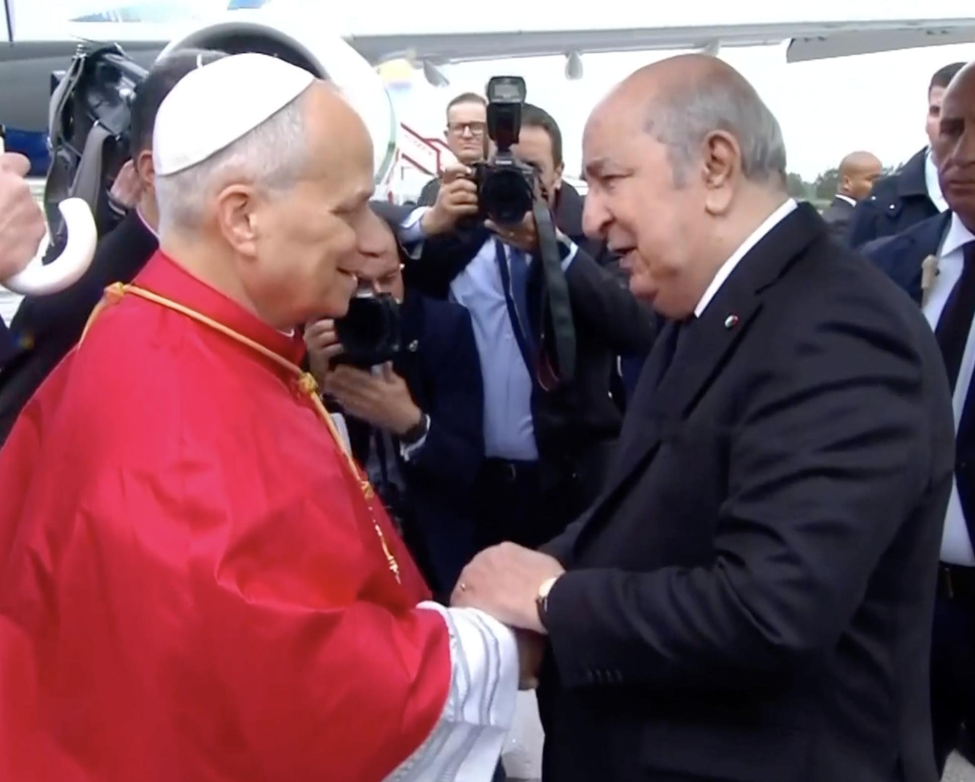 11h11 : Le président algérien Abdelmadjid Tebboune accueille le Pape avec les honneurs après que des coups de canon aient été tirés à sa sortie de l'avion